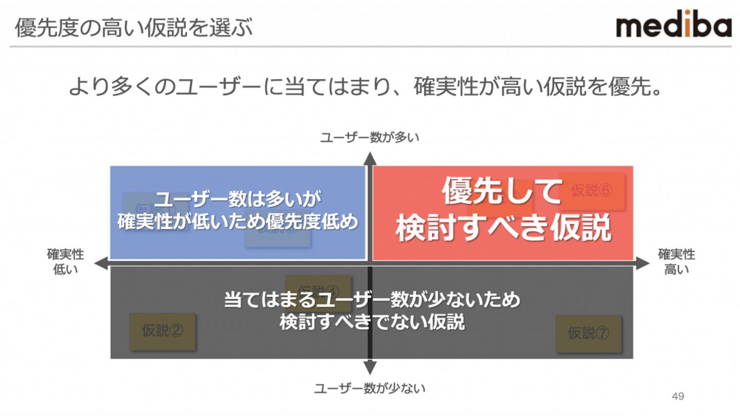 確実性の高い仮説を選ぶには、ユーザー数の多い / 少ない、確実性が高い / 低いを指標に優先順位をつけて適した場所に各仮説を配置することで、より多くのユーザーに当てはまる仮説になるのだそう。