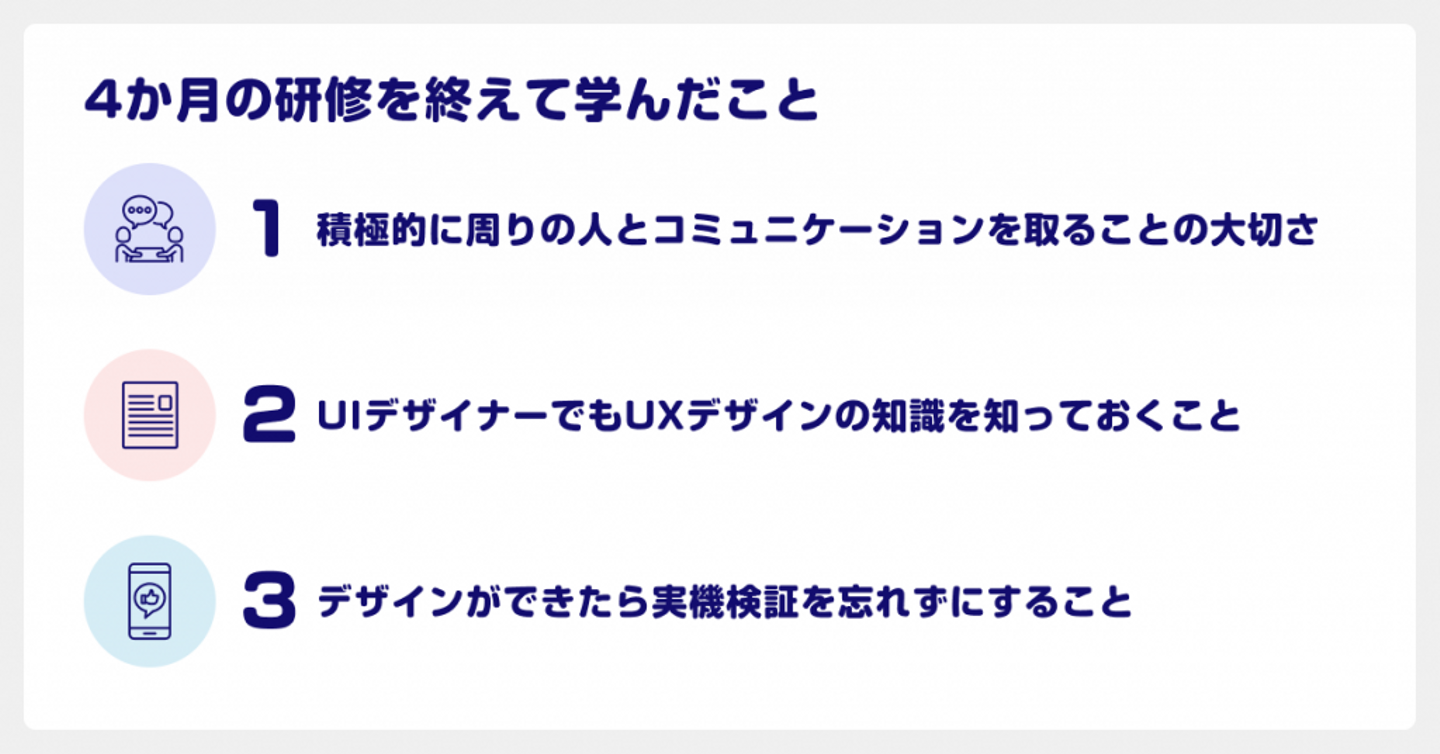 デザイナー研修はとても充実していて、あっという間だったなと思います。アウトプットのクオリティだけでなく、思考のプロセスにおいても自分がだんだん成長していく実感がありました。