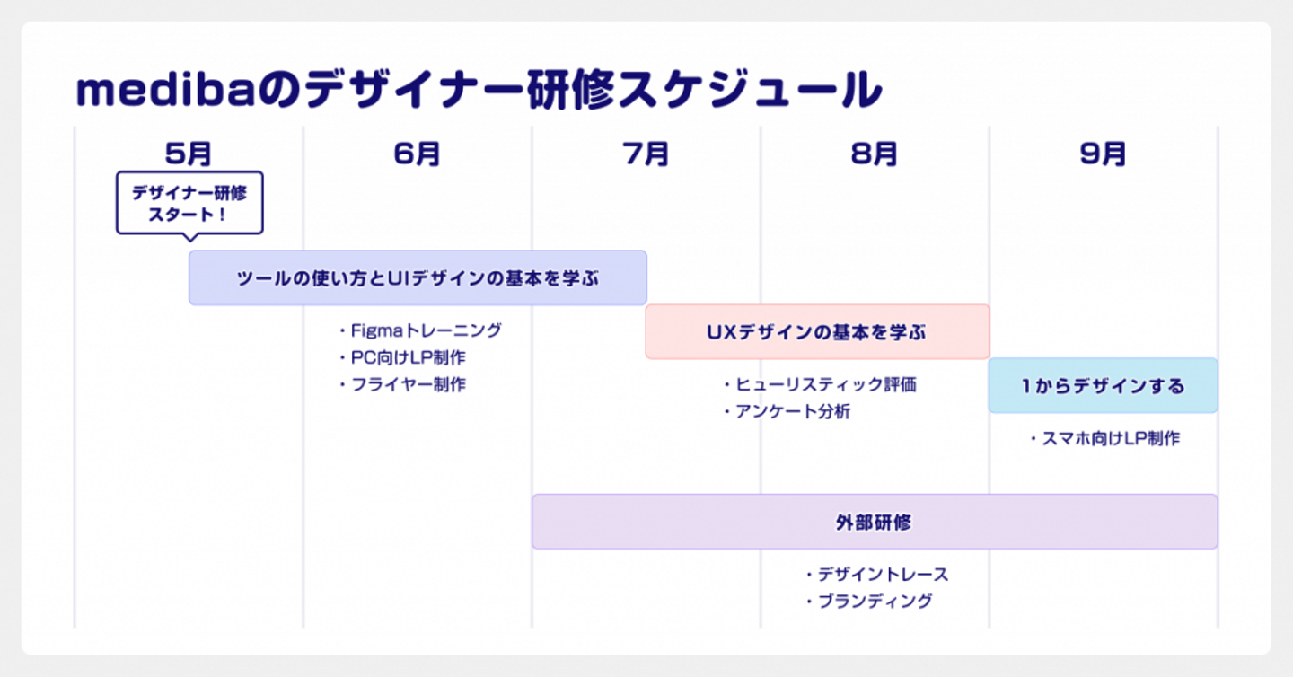 そこで今回は、私が新卒UIデザイナーとして受講したデザイン研修についてお話しします。medibaのデザイナー研修はとても手厚く、デザインの基礎を学びながら、実践を積むことでデザイナーとして成長できました。