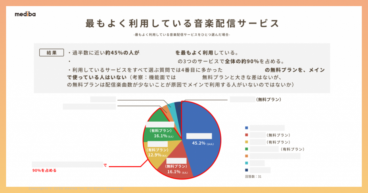 課題は、medibaの社員の音楽配信サービスの利用状況を調査するアンケートです。アンケートは設計の段階が非常に重要で、設計を綿密に行わないと、分析で必要になる情報を得づらくなることがわかりました。