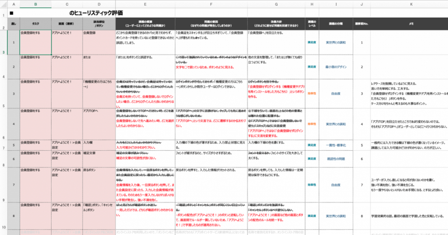 作成したヒューリスティック評価シート