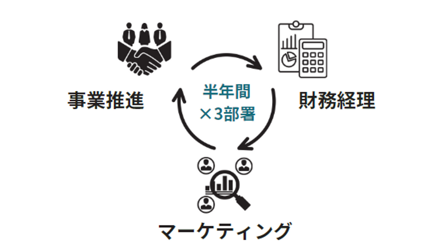 そのために必要なスキルを学ぶ期間が、部署ローテです。部署としては、事業推進・マーケティング・財務経理をそれぞれ半年間ずつ、合わせて1年半経験します(※)。