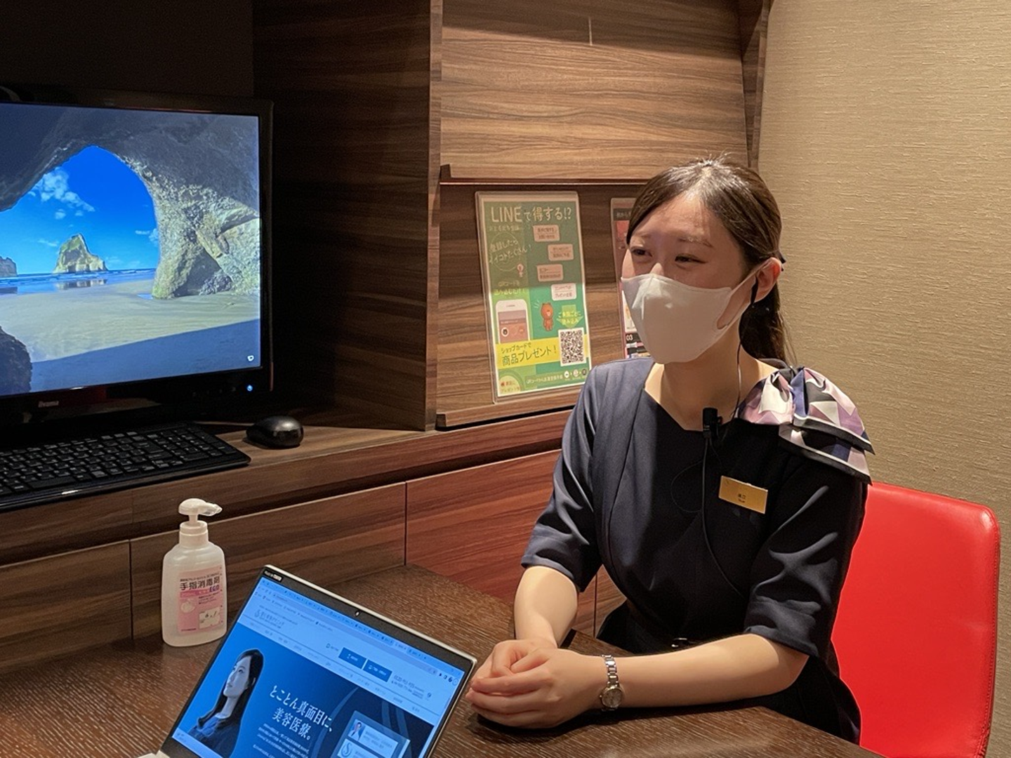 具体的には患者さまの来院時の対応やメールでの対応業務、在庫・カルテの管理などのバックヤード業務があります。2年目に受付アシスタントから受付カウンセラーに昇格したことで、患者さまの電話対応ができるようになりました。また来院対応では、三大手術と呼ばれる豊胸術、脂肪吸引、フェイスリフトのプレカウンセリングの担当にもつけるようになりました。