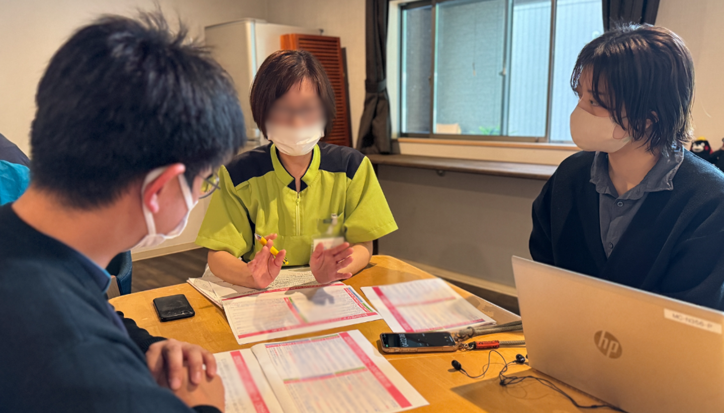 👆介護施設で職員さんから真剣にお話を聞く松本さんです!
