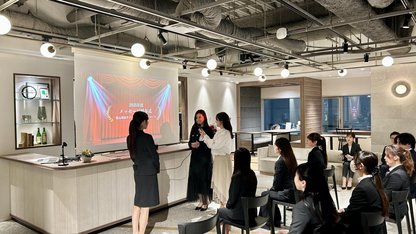 午後は、六本木にあるメディクルードオフィスに場所を移しました。メディクルードと聖心美容クリニックの新入社員8名と先輩社員がラウンジスペースに集まり、"メッセージ授与式"が行なわれました。メッセージ授与式では、メンター/トレーナーとなる先輩社員から新入社員一人ひとりに歓迎と激励のメッセージが贈られました。