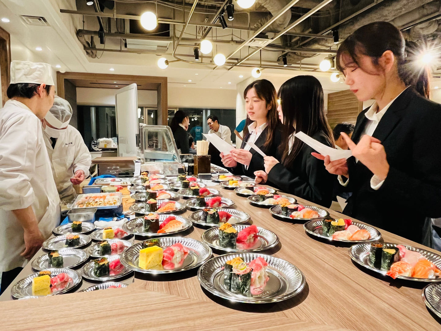 夜はいよいよ懇親会です!今年は寿司職人さんをお招きして、お寿司をその場で握っていただくという豪華な企画。お寿司のほかにも、いろいろな料理を囲みながら新入社員と先輩社員が交流を深めました。