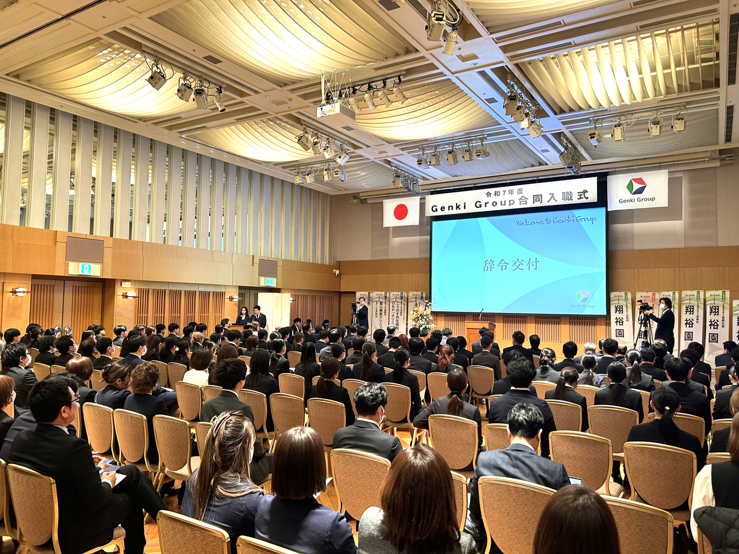 午前中は、Genki Group全体の合同入職式がさいたま新都心で開催されました。医療・介護福祉・教育など、幅広い領域で活躍することになる60名以上の新入職員が一堂に集まりました。さらには、京都府に設けられた西日本会場ともオンライン中継を繋いで、合わせて102名の新入職員をGenki Groupの仲間として迎え入れました。会場は緊張感と期待が入り混じった新鮮な空気に包まれていました!