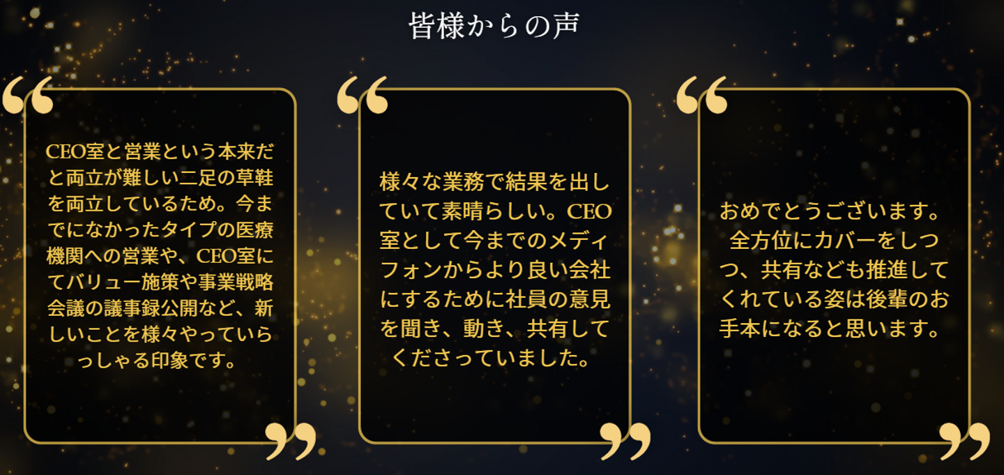 改めて読み返すと、CEO室に入ってから本当に多くの人と関わるようになったんだなと感じました。その中で、日々の動きや姿勢を見てくださっていた方がいて、こうして評価していただけたのかなと思っています。