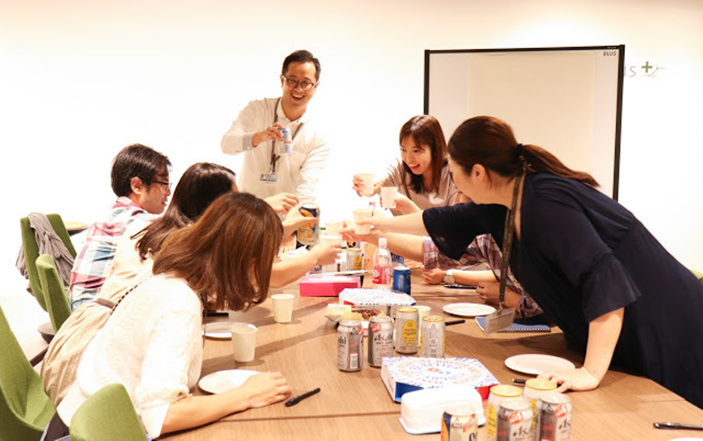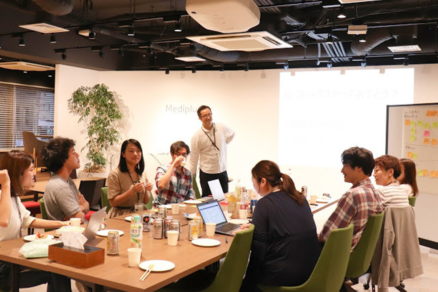 終業後にみんなでピザ🍕とお酒❤️を片手にメディプラスの施策について話します(^^)