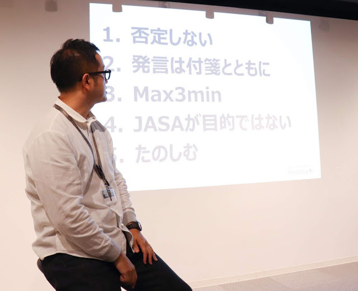 そうそう。話が3分以上になると、こんなプラカードが(笑)。