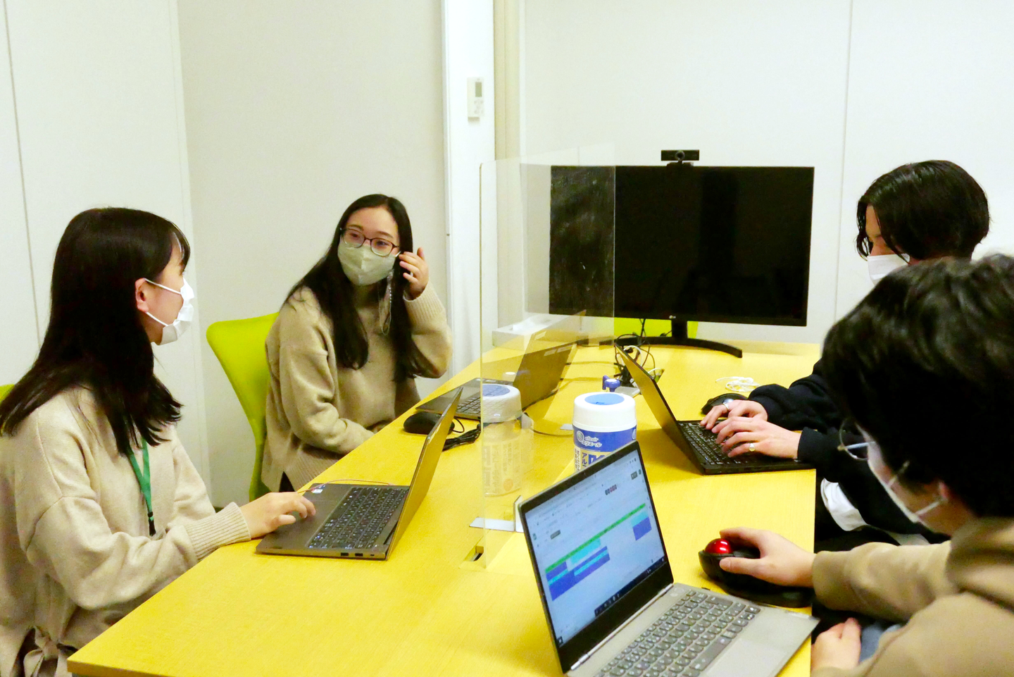 インターンリーダーYさん「最近は就活で勤務が減っているメンバーもいて、勤務日を合わせることが難しい場合もあって。勤務がかぶらなくてリアルタイムでの解決が難しくても、slackのメッセージで解決が現実的かなぁと」