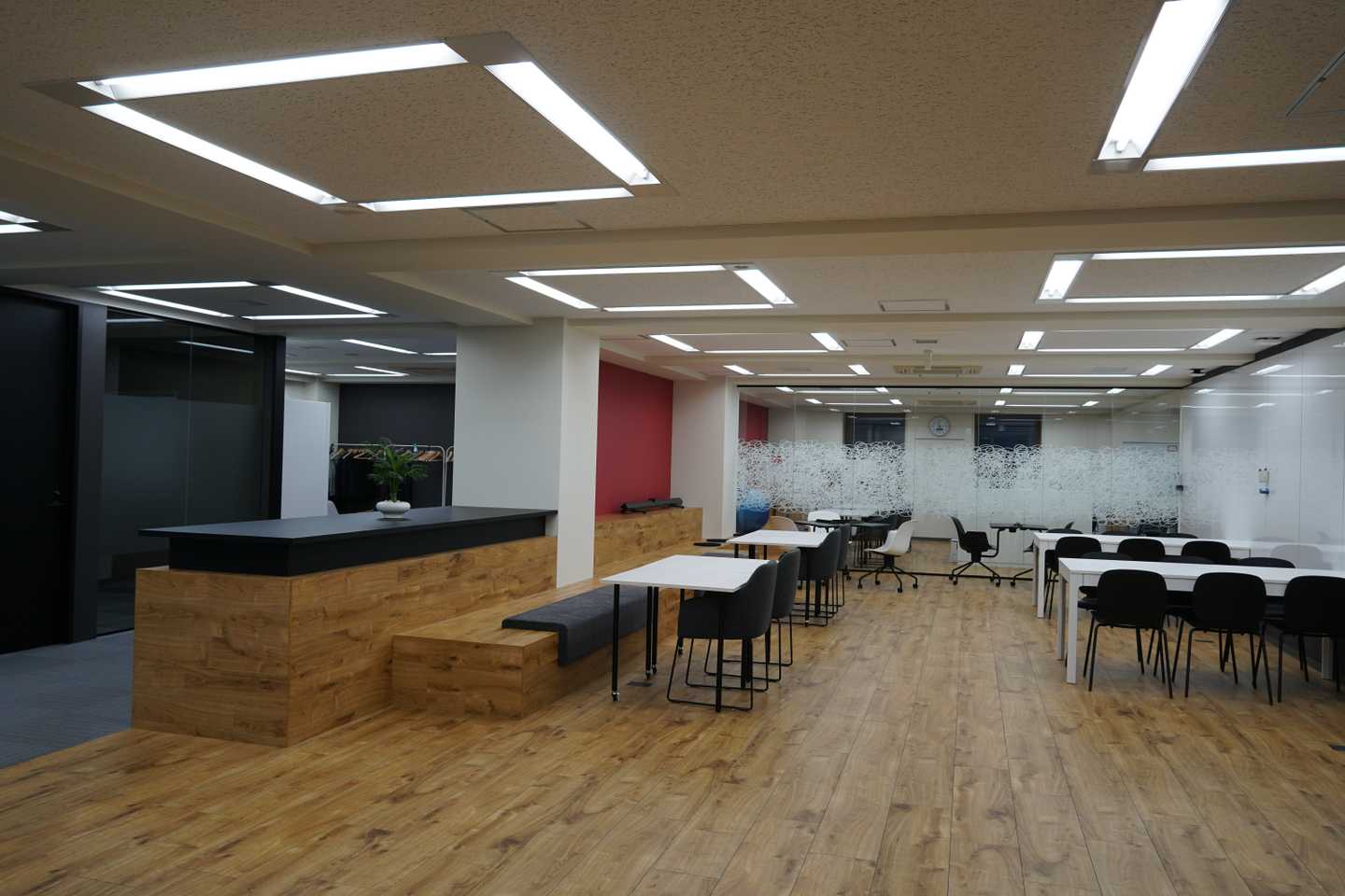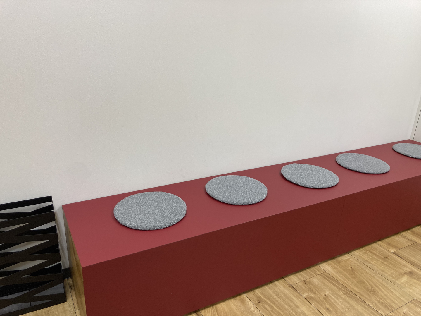 UXONEは五反田にあるオフィスビルの5階と7階で、5階の待合スペースにはメンバーズカラーの赤いベンチが置いてあります。