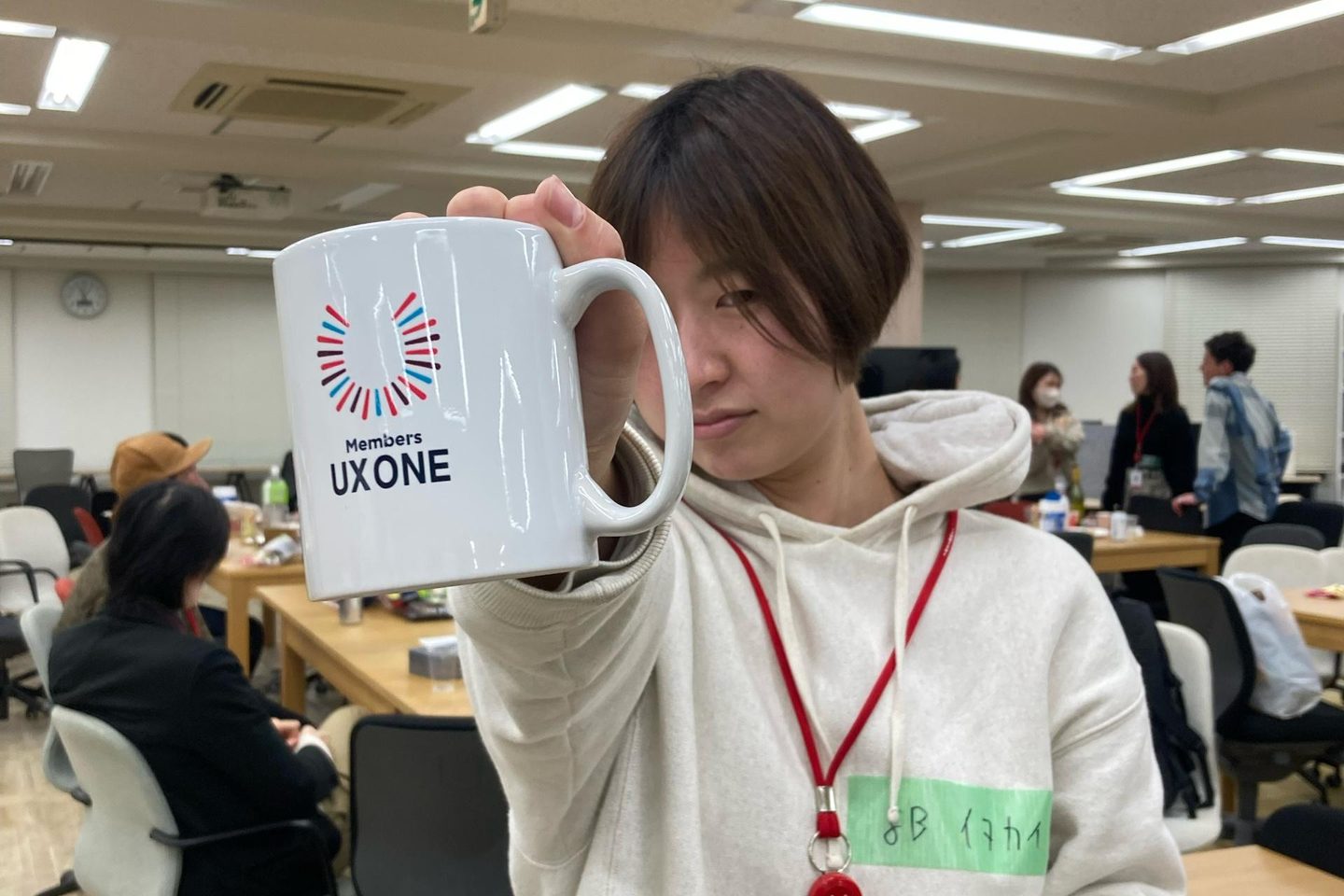 懇親会にてUXONEロゴ入りマグカップをゲットした犬飼さん