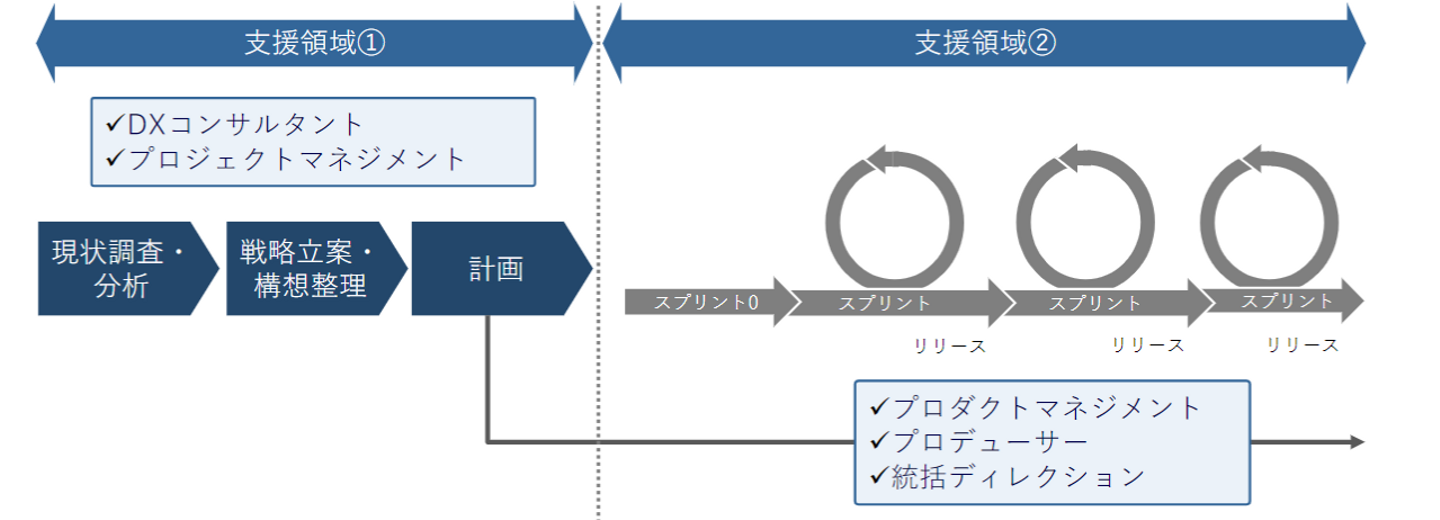 お客様の課題を把握・整理する「支援領域①」の部分から、課題を解決するためのプロジェクトの立ち上げ〜推進の「支援領域②」までをDXコンパスが担当します。