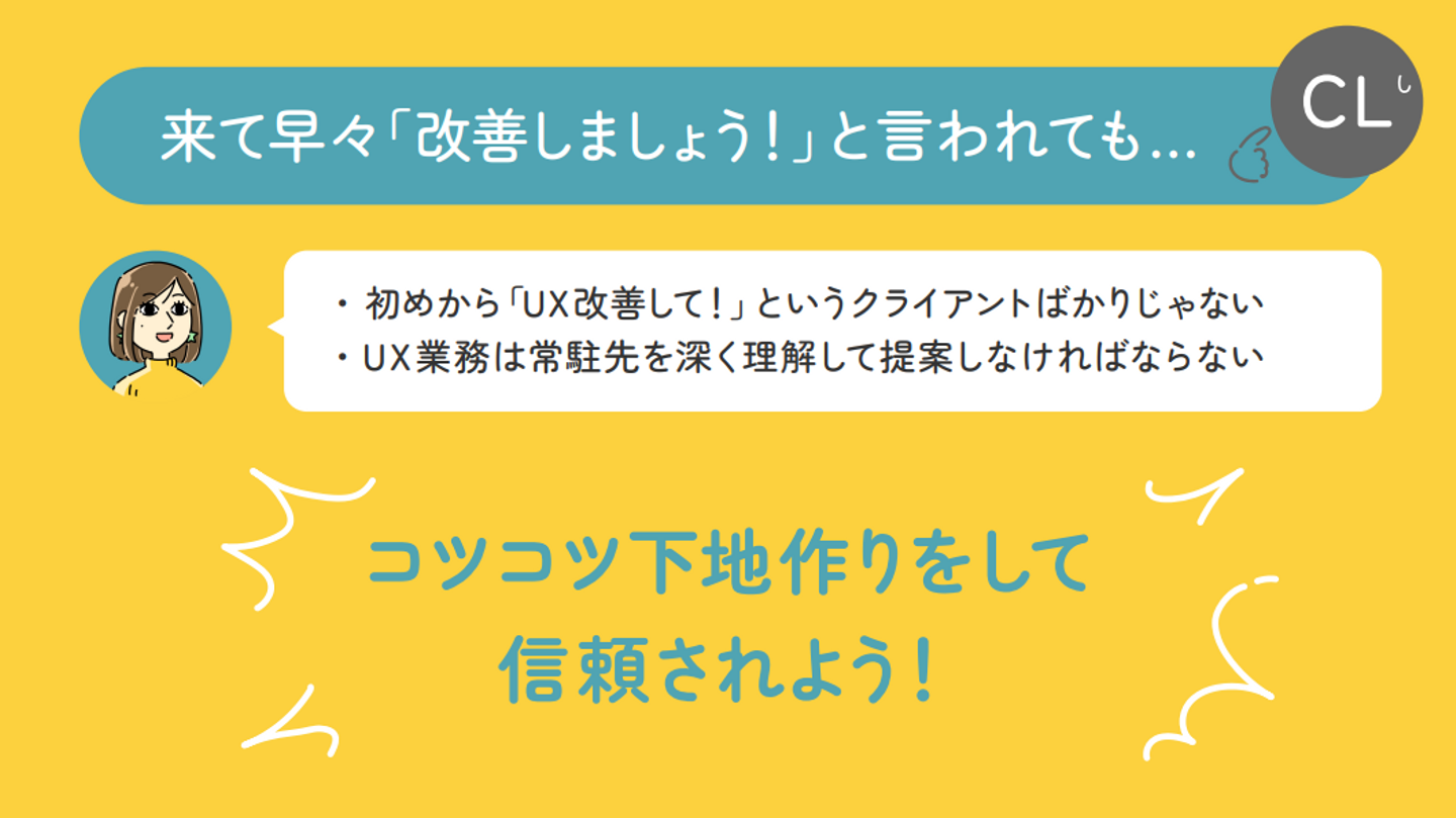 たしかに、入ってきて早々にUX改善を提案されるよりも、一緒に業務をしていくなかで相手のことをよく知り、理解を深めた上で提案をする方が常駐先にとっても納得感のある提案をできるかもしれません!