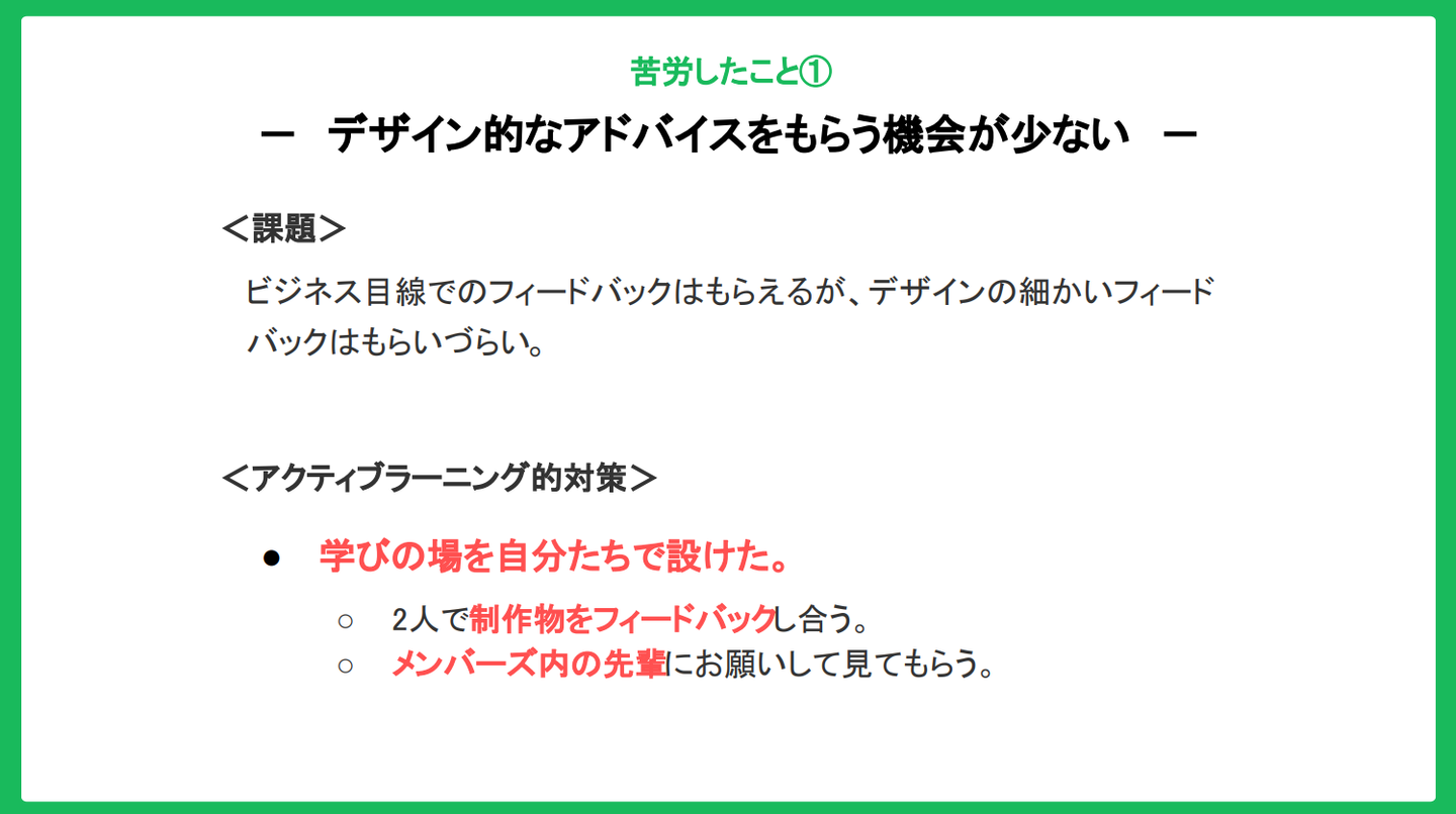お二人はプラットフォームサービスを提供する企業のマーケティング部にデザイナーとして常駐されているそうなのですが、その部署には他にデザイナーの先輩社員がいないため、デザイン的な観点でのFBを受ける機会が無いのだそうです。
