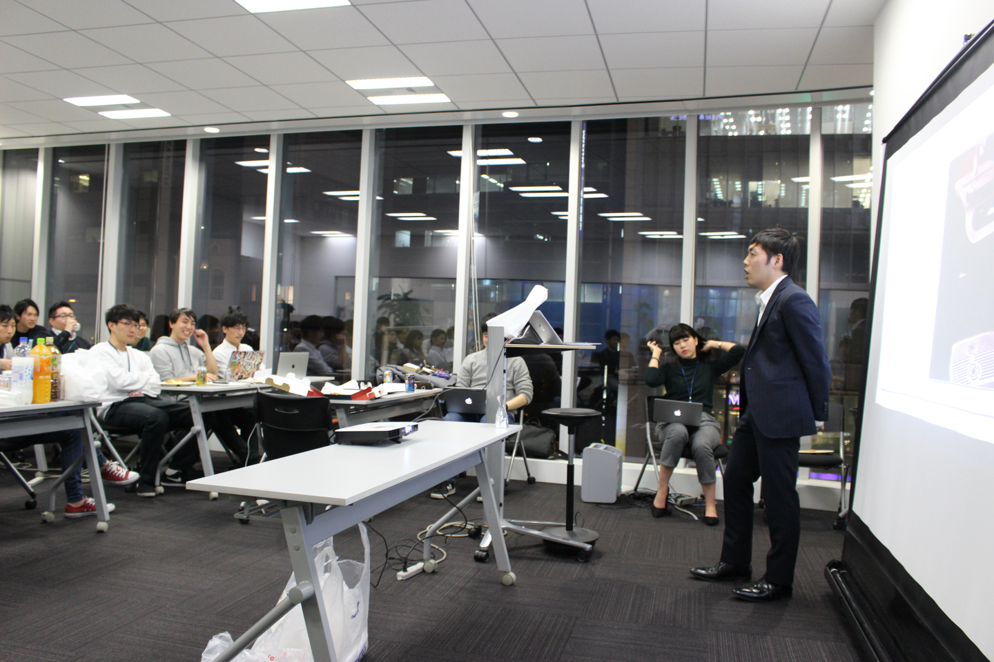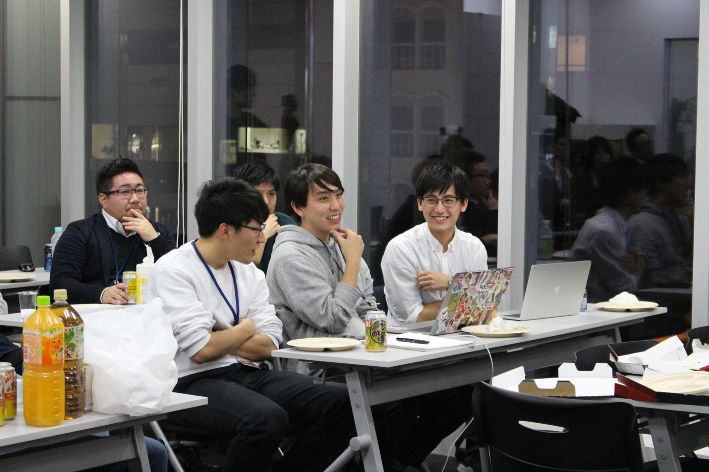 (ピザを食べながら、飲みながら発表を聞くメンバーたち。)