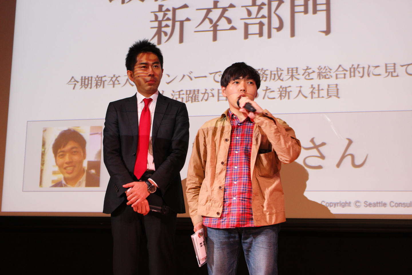 ↑ 最優秀新人賞新卒部門を受賞時に、舞台上はライトが眩しいなと思っている顔(写真右)