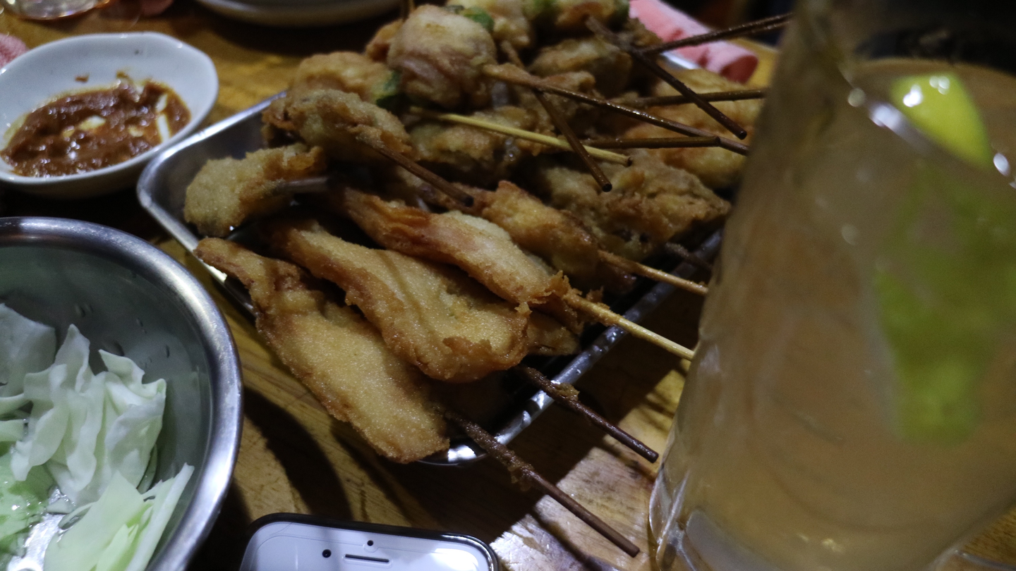 2店舗目は多くの参加者が食べたことの無い、近くの串カツ屋『どんがらがっしゃん』に入店!スタッフは乾杯文化や多くの串カツ屋さんが定めているソース二度漬け禁止のルールを新鮮な気持ちで説明しました。参加者にとっても新鮮な体験だったのか、メキシコ出身のGCさんは、ししゃもやウズラなど自国では食べることができないメニューを中心に注文をしていたのが印象的でした!