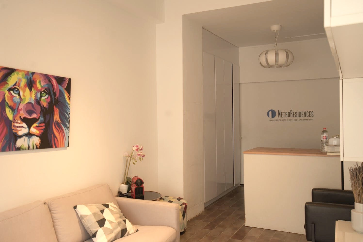 メトロレジデンスロゴ(旧ロゴ)のスライドドアの後方はチェックアウト後のゲストの荷物置き場として利用できるのもとても便利な仕様!