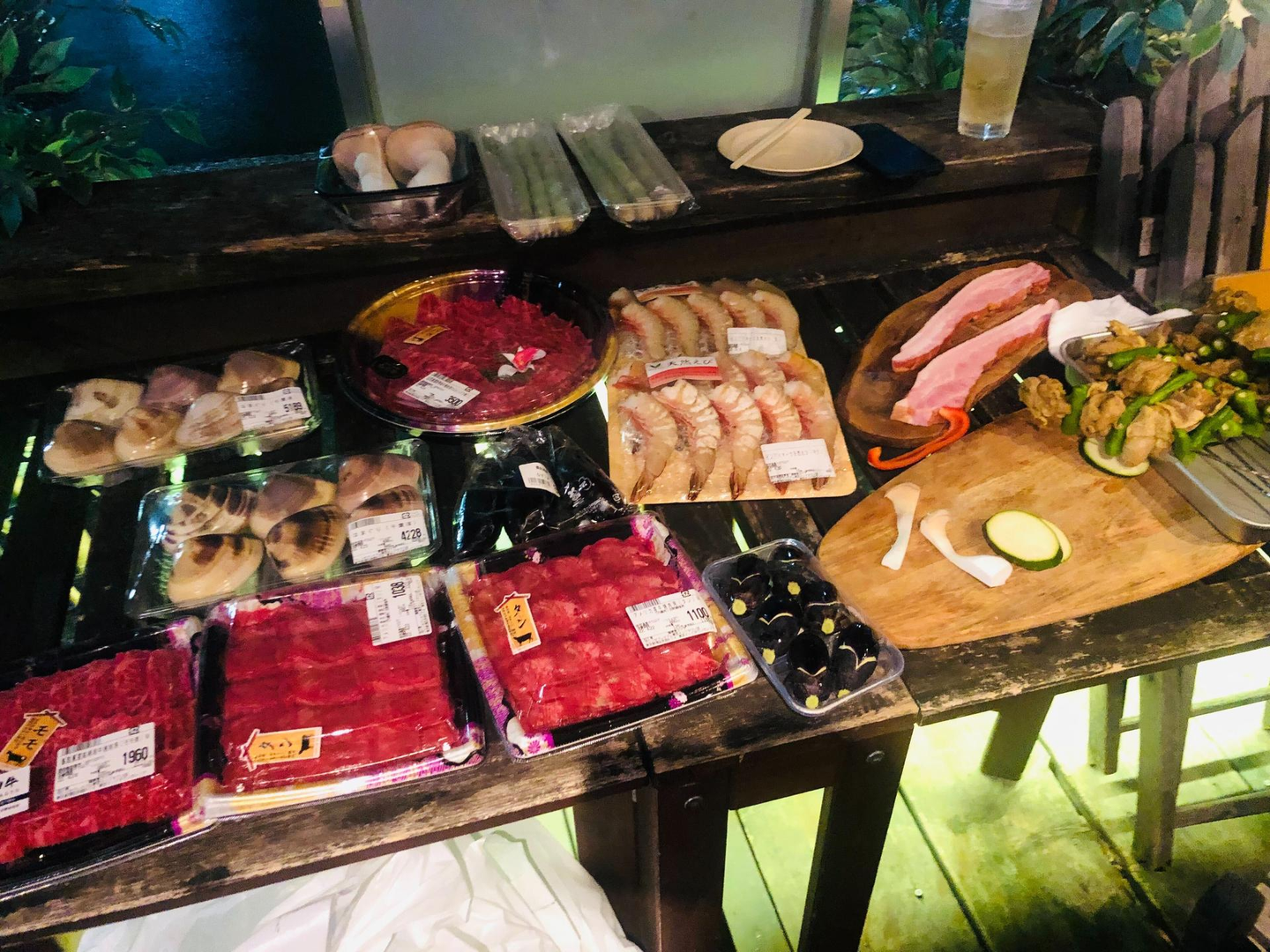 食事はセットメニューのソーセージ、ベーコン、ピーマンのチーズ詰め、スパイシータンドリーチキン、ステーキの他に、シーフード、野菜、牛タン、ハラミなども持ち込みました!