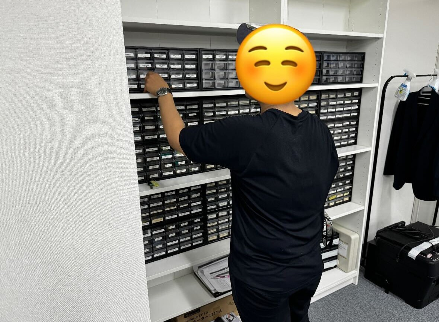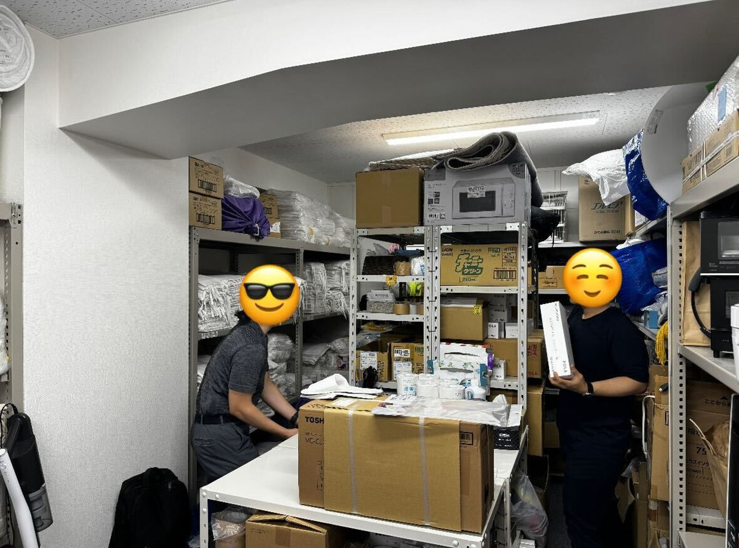 そんな二人の朝はオフィス倉庫にあるリネン類、消耗品、その他備品に清掃用具等を持ち出すことから始まります。