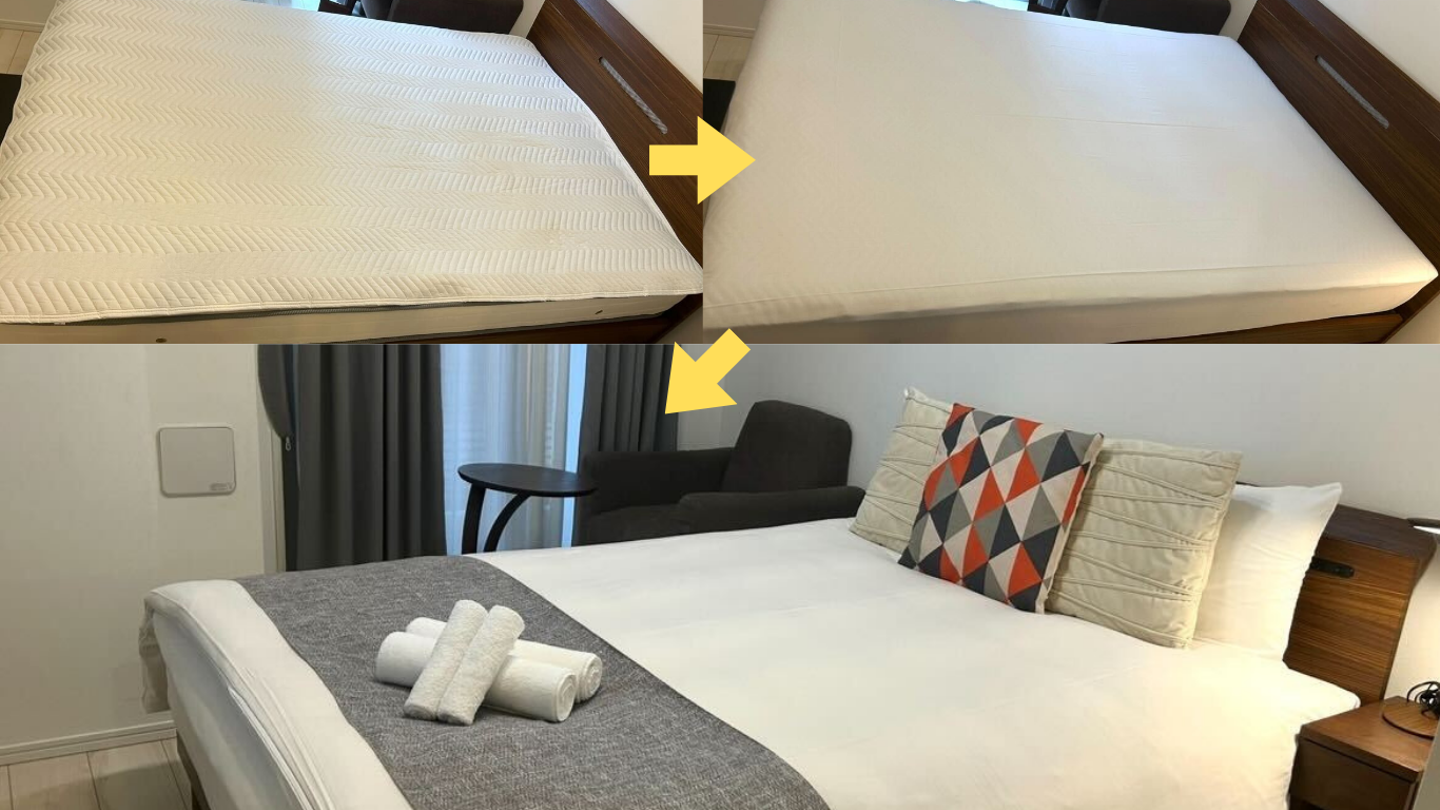 お客様のプライバシーもある為、お部屋全体をお見せすることは難しいですが、チェックアウト後のお部屋のベッドでBefore/Afterを撮ってきてもらいました!