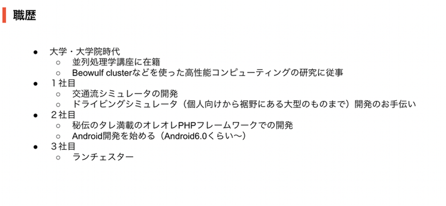 大学・大学院時代は、情報工学を専攻し、並列処理の研究をずっと行っていました。卒業後、1社目では某自動車会社のドライビングシミュレータ開発などに携わっていました。2社目では、PHPのWeb開発に携わっていたのですが、途中で上司から「Androidの開発をやってみない?」と誘われ、そこで初めてAndroid開発をやり始めました。