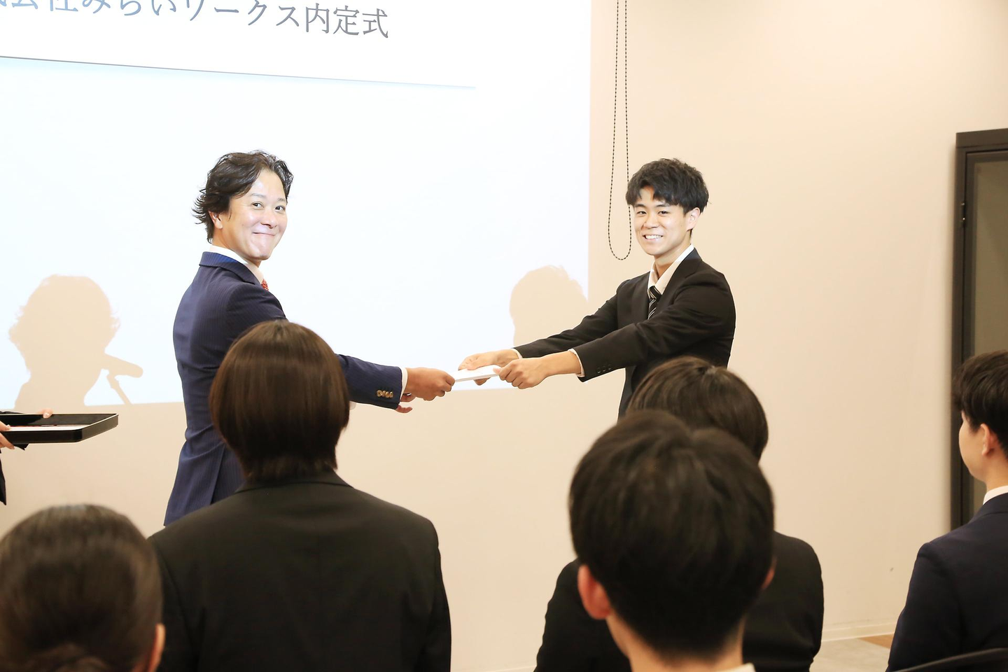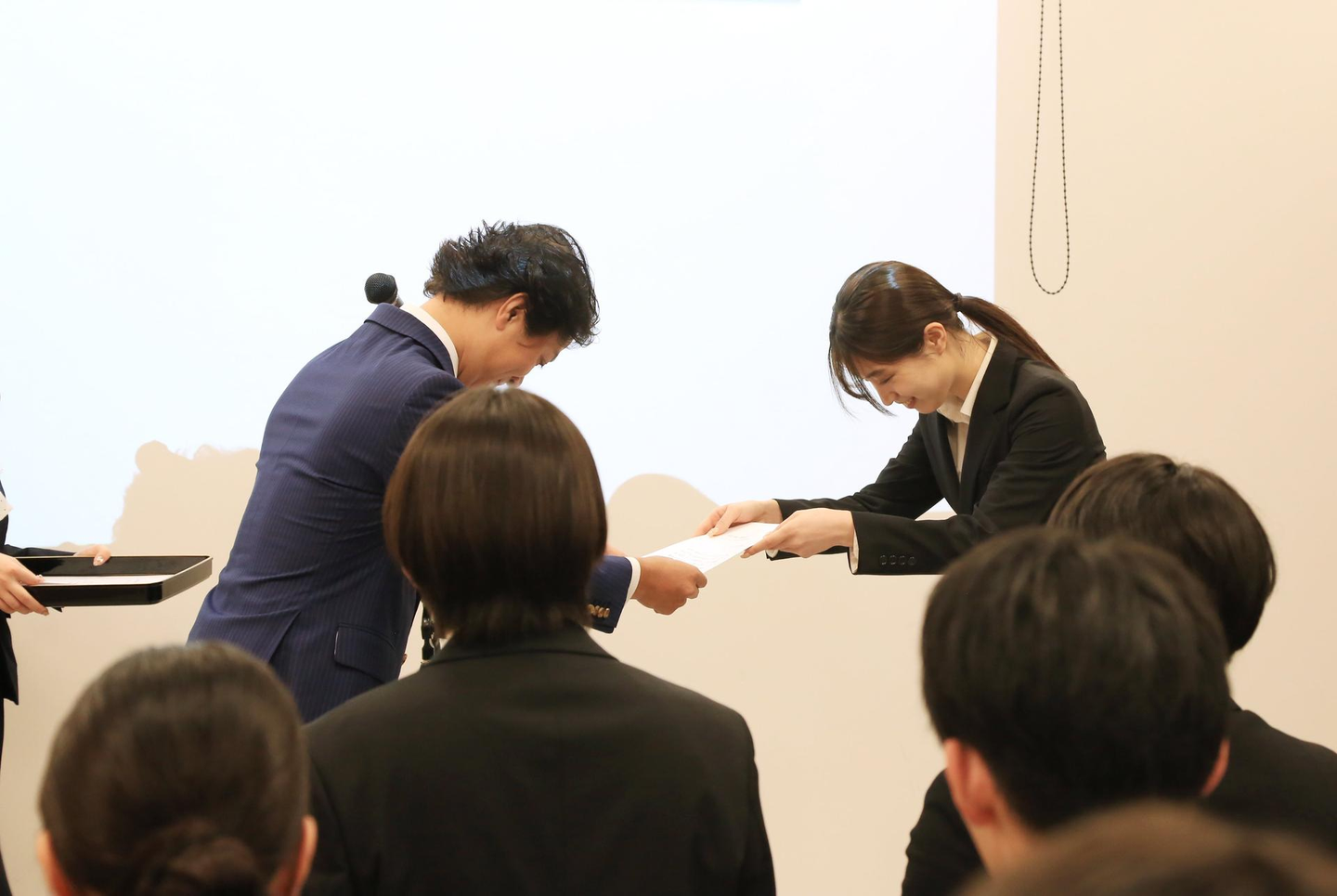 一人ずつ名前が呼ばれ、代表から内定証書を受け取る瞬間は、緊張とMWSの一員となる誇らしさが入り混じる時間でした。