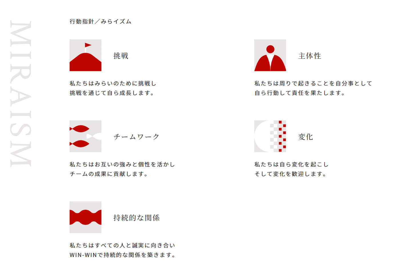 株式会社みらいワークス(MWS)では、プロフェッショナルが成果を出し続けるための行動様式として上記の行動指針を掲げています。