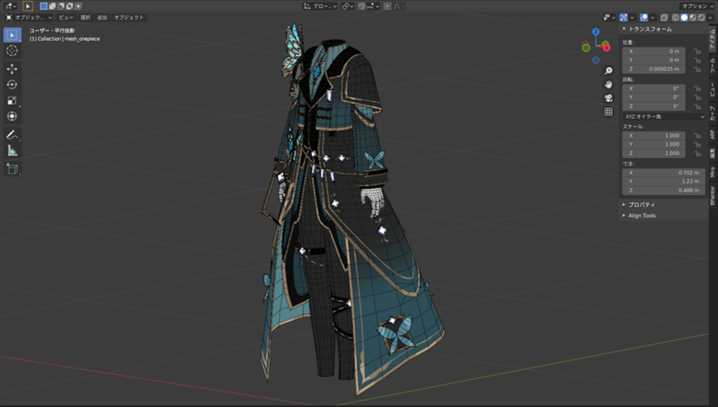 そこから3Dデザイン業務を始めますが、僕がモデリングで使っているのはBlenderです。作りながら不明点や難しい部分が出てくるので、都度2Dデザイナーさんと相談しながら進めていきます。それが終わったらUV展開をして、テクスチャリングをして、ボーンに対してウェイトを振ってスキニングして。そのあとUnityにモデルデータを持っていって、マテリアル設定などをします。最後に、アバターチェッカーを用いて全体像を確認して、2Dデザイナーさんと最終調整をして終わり。通常はこんな流れですね」