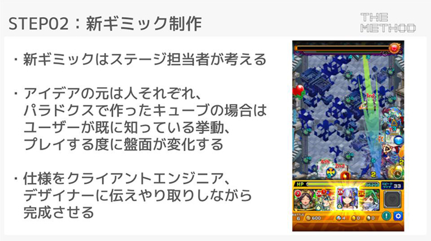 林 まず制作者のアサインですが、新ギミックを作成するステージの場合、リリースの3~6ヵ月前くらいにアサインを決めます。というのも、モンストでは1~2ヵ月ごとにアプリのバージョンアップデートを行なっているため、新ギミックがある場合はあらかじめアップデートに入れなければいけないので、早めにアサインをしています。この後、ご説明するパラドクスというキャラクターも7月リリースだったのですが、1月くらいにはアサインをしていました。もっと長いものだと、ほぼ一年かかったものもあります。