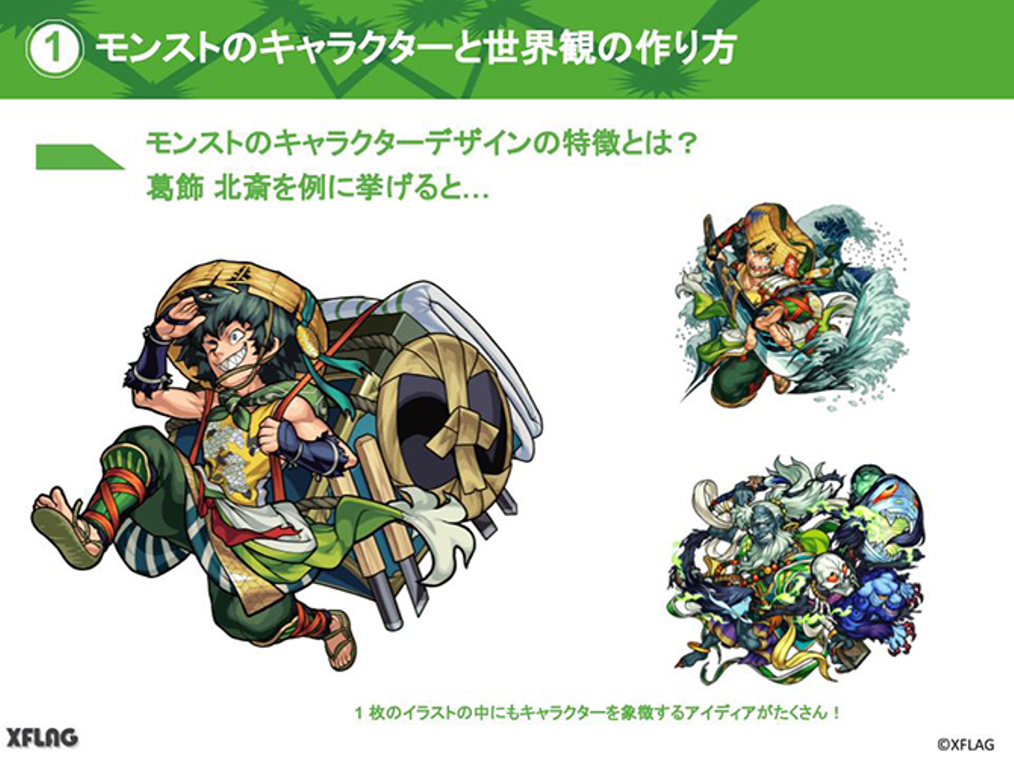 和田 モンストのキャラクターデザインは、大きく分けて3つのパターンで制作されています。一つ目が王道のキャラクター。左側の「オベロン」は、王道的なかっこよさだけでなく一癖も二癖もあるキャラクターです。真ん中は「ギョウズィ」。中華料理の敵をキャラクターとして制作した、ユニークで思いも寄らないモチーフ選びが特徴です。右は「葛飾北斎」。実在した人物も独自のアレンジで個性溢れるキャラクターにしています。