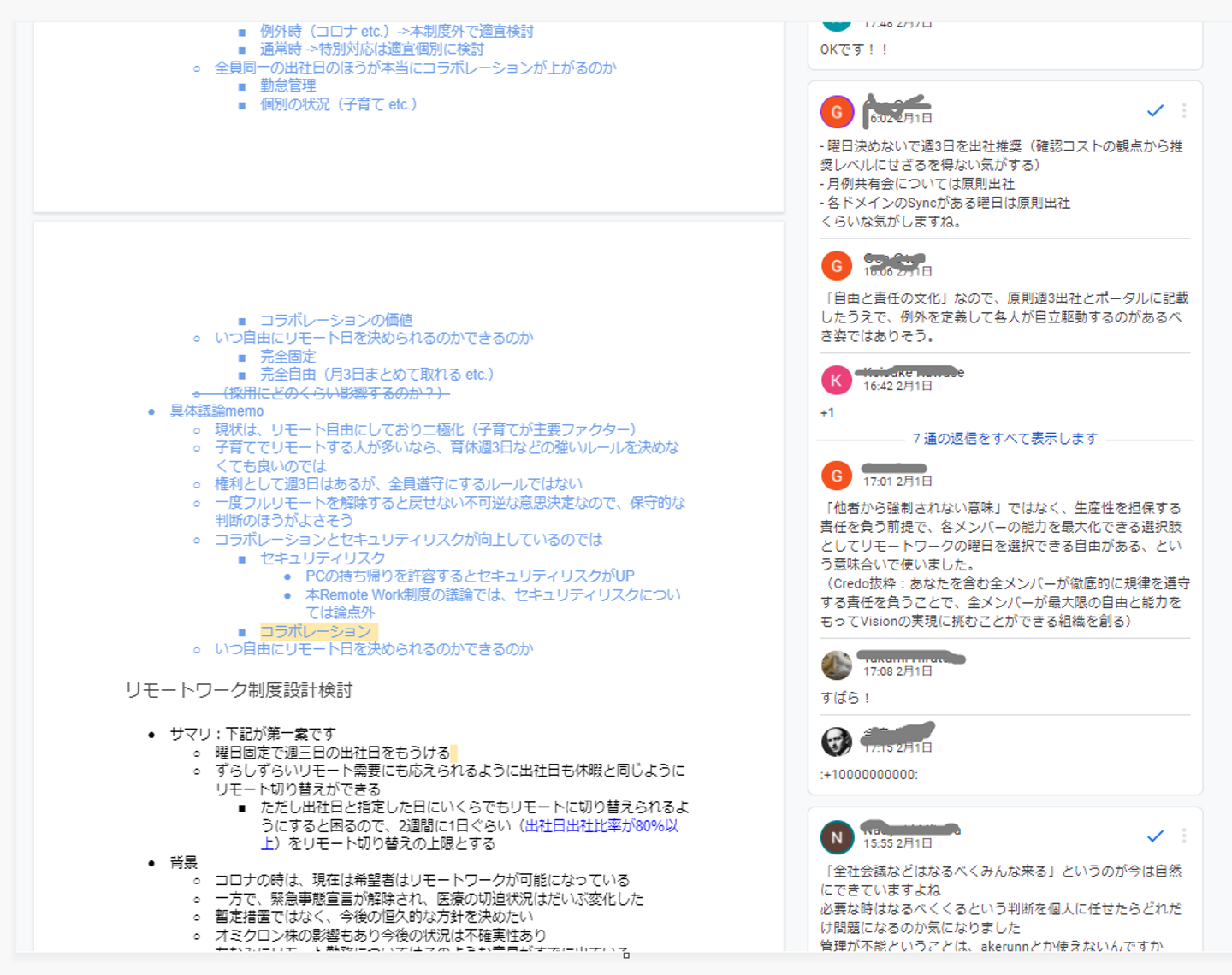 最終的に会社としてどういう運営をしていくかというところで、以前の記事でご紹介しましたが、これまたBoardがまとめた案にメンバーが忌憚のないコメントをつけまくるという方式で、全メンバーで議論を行いました。