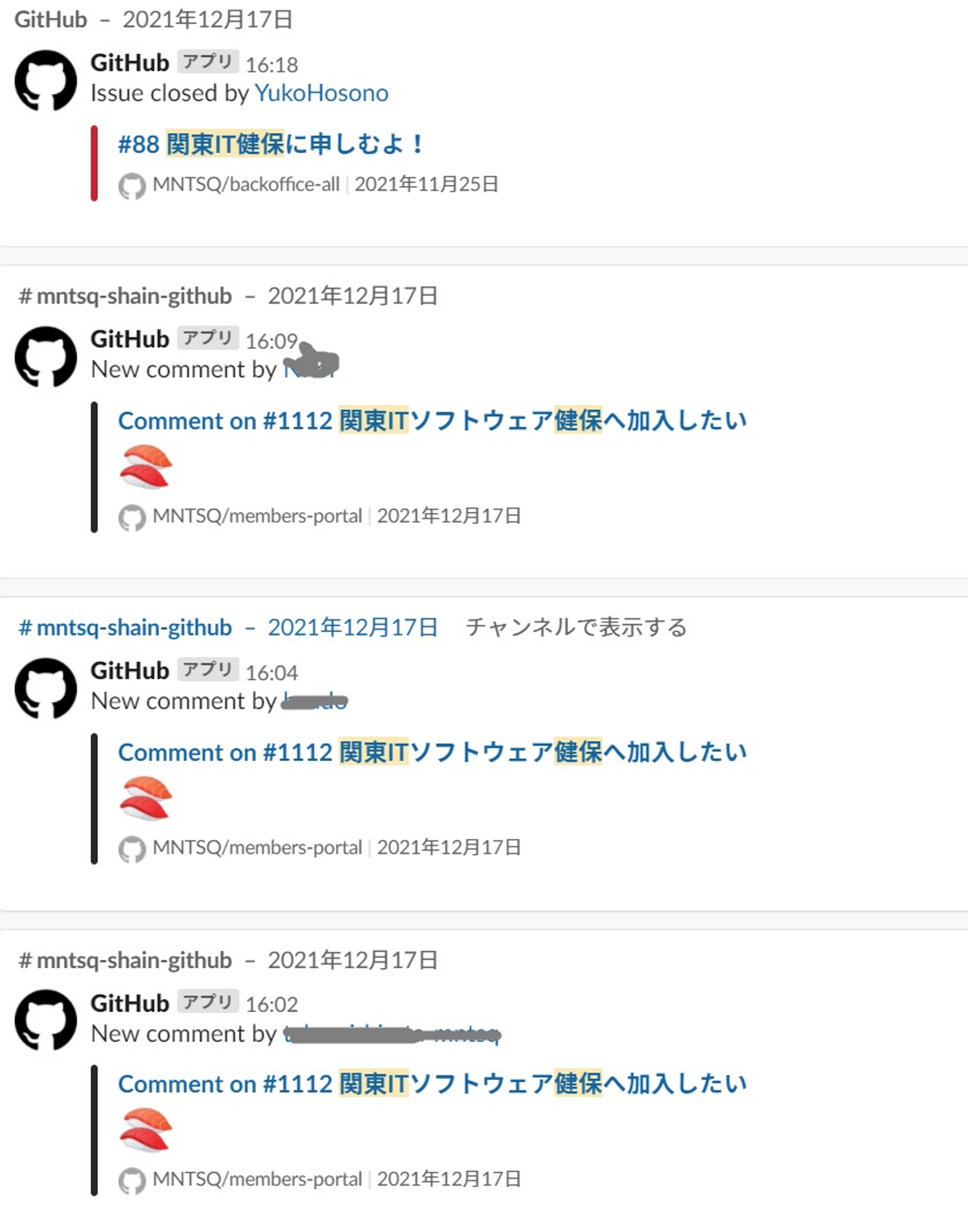 関東IT健保は、福利厚生?の一環として、健保加入者とそのご家族はおいしいお寿司が割安で食べられることで、スタートアップ界隈では有名かと思います。MNTSQメンバーもその前評判に一同胸を躍らせており、申込するよ、したよ、一次審査通ったよ、と、社内に進捗報告するたびに、社内のSlackやGithubが寿司スタンプでいっぱいになりました。実際に加入できるのは5月以降のようですが、みんなでお寿司を食べに行く日が今からとても楽しみです。