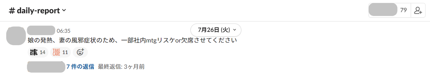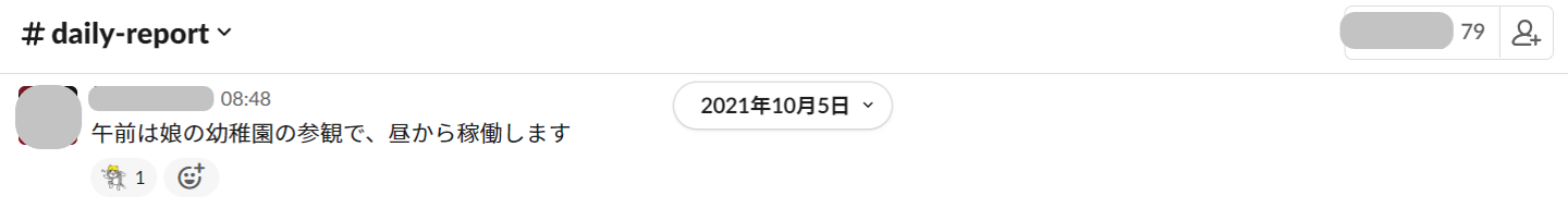 (パパママ社員の働き方の一例。MNTSQでは全社員が自身の出欠や現在の状況をSlackのdaily-report-channelで共有することで、フレックスやリモートでもコラボレーションの質は落とさないように努めています)