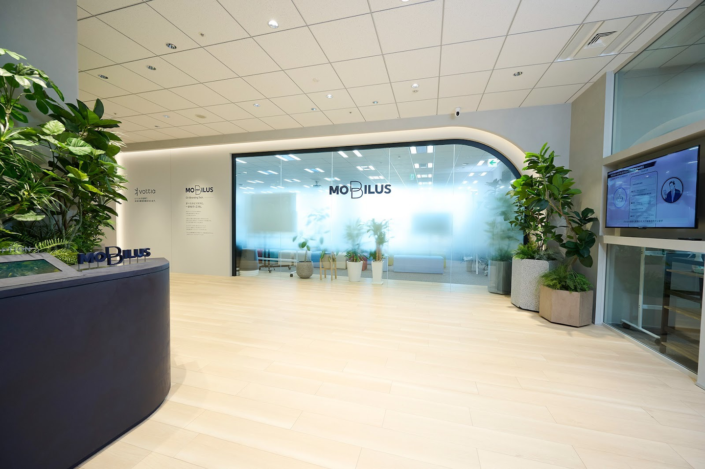 そして奥にはオフィスへとつながるガラス張りの窓。窓右上のカーブは「人とテクノロジーの調和」を表現しています。モビルスでは生成AIに代表される最新技術を取り入れた製品開発を行っていますが、真に価値ある製品に仕上げていくには、人に寄り添った視点が大切だと考えています。まさに窓のカーブがモビルスが大切にする「人に寄り添う視点」を象徴しています。ちなみにMO「B」ILUSのBともかけて曲線を描いており、カーブにこだわって制作いただきました。来社された際にはぜひチェックしてみてください。