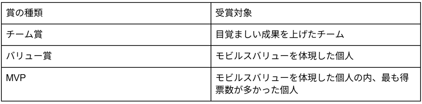 モビルスアワードは、チーム賞、バリュー賞、MVPの3つの賞で構成されています。受賞者には、栄誉を称える賞状に加え、豪華な副賞が贈られます。
