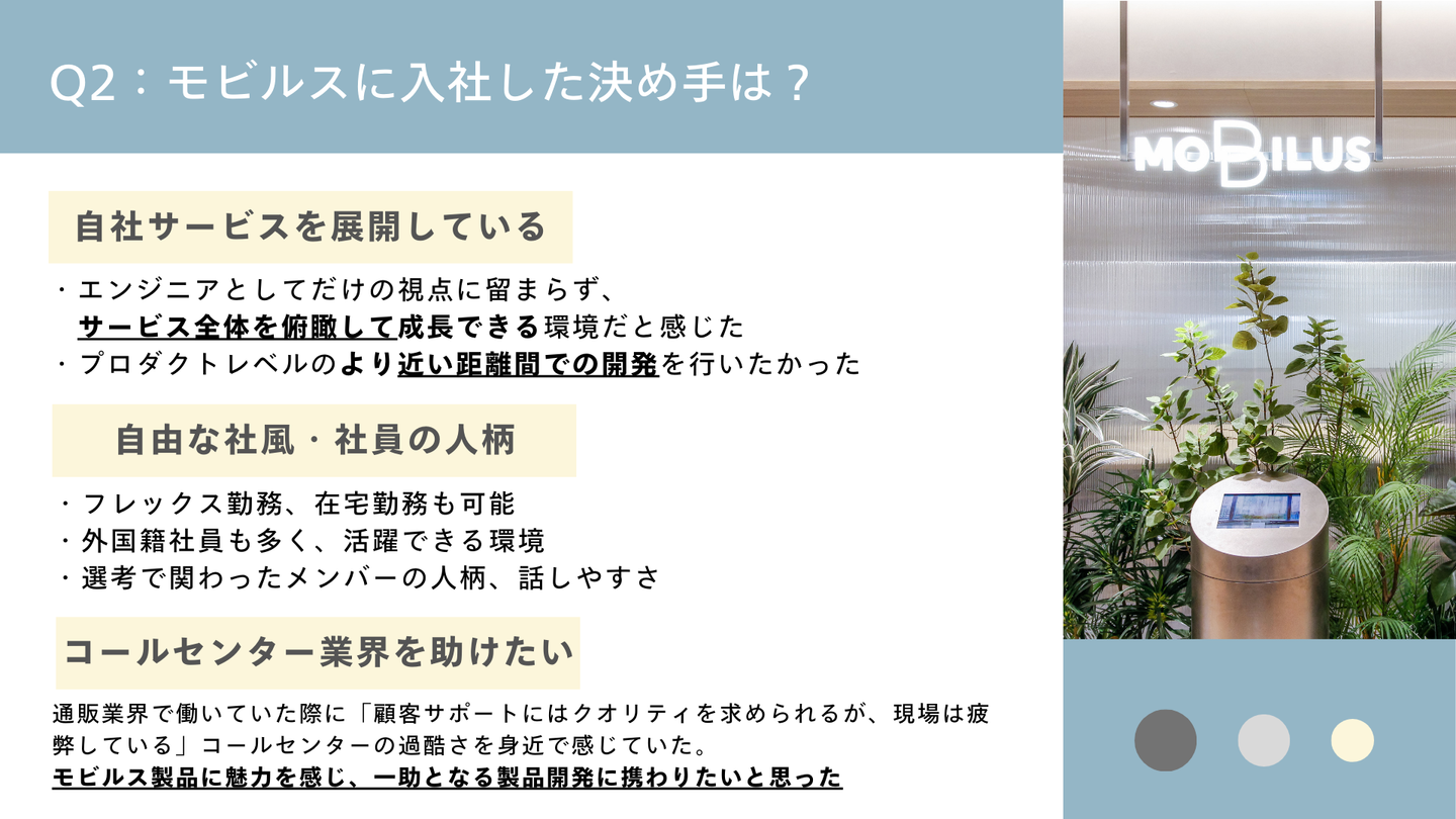 以前の経験を活かし、コンタクトセンター業界を助けたかったとの思いやりや、自社サービスを手掛けて成長したいという向上心の高さから、溢れるモビルスバリューを感じました!