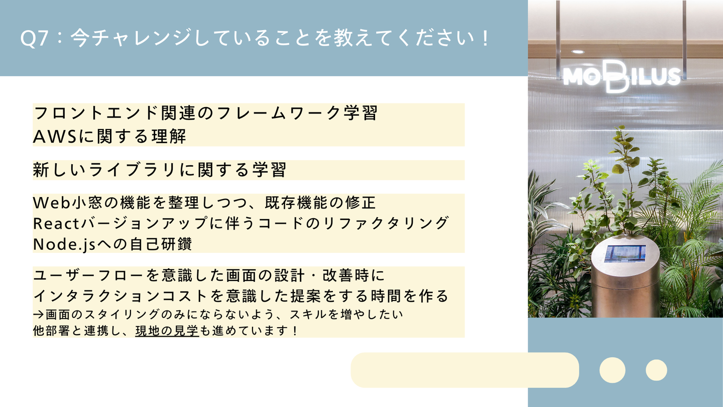 それぞれが業務にあたる上で、もしくは業務時間外で新たにチャレンジしていることについて教えていただきました。