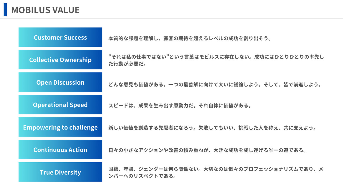 特に今回は会社の価値観を皆さんに知ってほしいと思い、モビルスのバリューとそれを実際に体感したエピソードを執筆することに決めました。