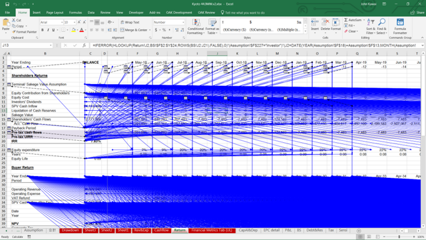 上記は、中東の発電所計画に係る事業計画のシミュレーションを行う財務モデルです。シート数は 35 枚、数式の数をカウントすると 272,750 個。ユニークな数式を解析すると、6,318 個でした。ファイルサイズは 28MB なので、エクセルで開くことすら 30 秒ぐらいかかったりします。ちなみに、シートの内のリンクをみると、以下のような感じです。麺がよく絡まっています。