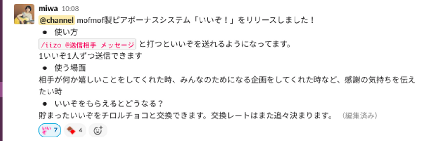 既存のピアボーナスのサービスを使っている企業が多いかと思いますが、それをmofmofでは、slack上で行えるようにメンバーが仕組みを作ってくれました!