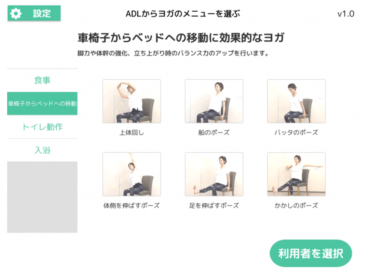ADLのアウトカム評価「バーセル指数」における評価項目のそれぞれに、オリジナルメニューを用意したiPad用アプリ『ADLのためのシニアヨガ』をリリースしました。このヨガアプリを使うことで、高齢者の健康寿命が伸びることを期待しています!
