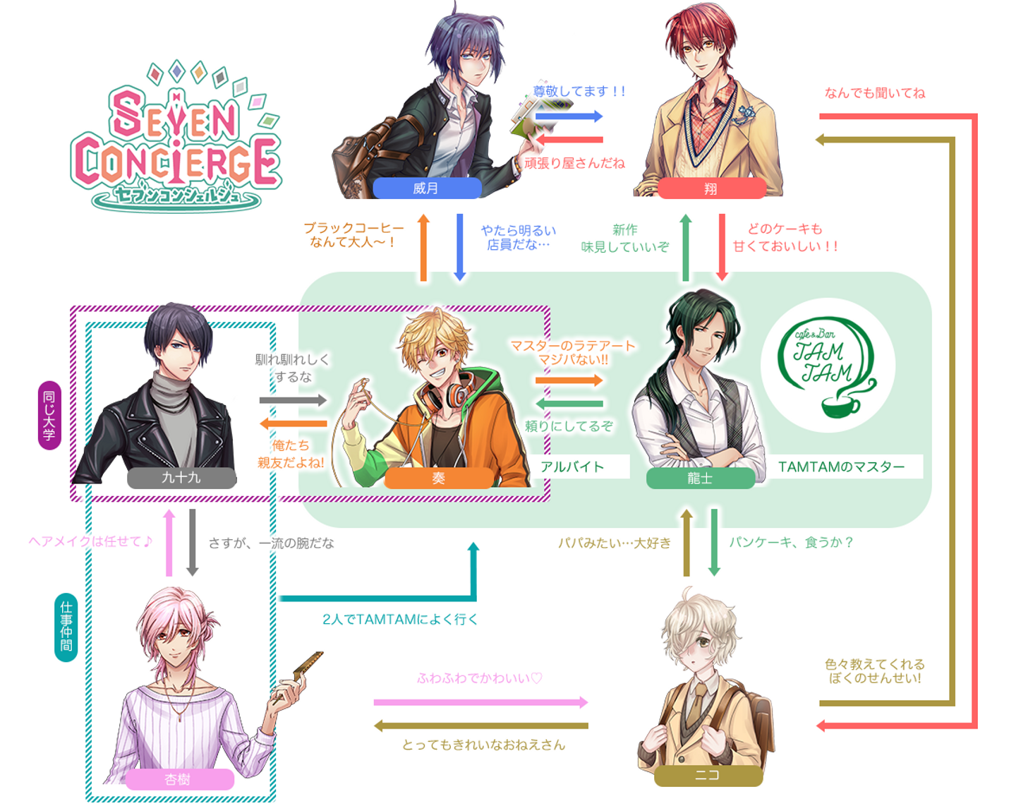 西井:競ってないですね。いろんなところでつながりがあって、まだWebで相関図が出せてないんですけど。(※取材時点。現在は下記相関図が公開済)このお兄さんキャラの氷室さんがカフェを運営していて、そこが最終的にはつながってくる、っていう設定で。
