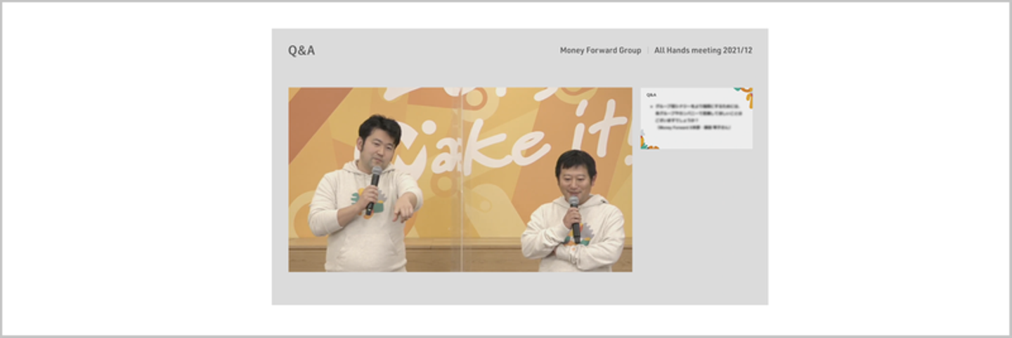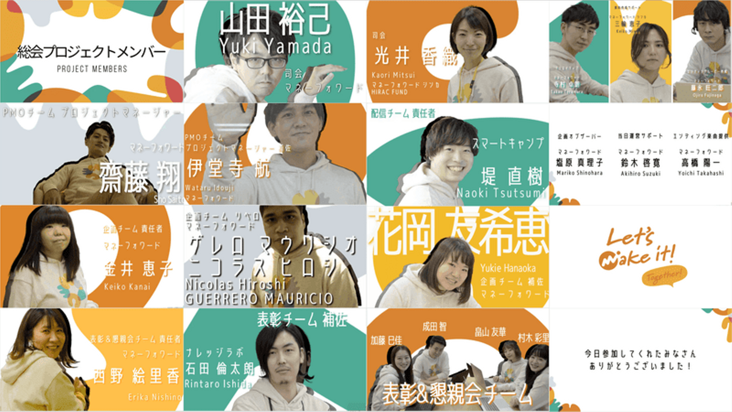 マネーフォワードグループ半期総会とはグループみんなでワンチームになりたいという想いをこめたコンセプト「Let’s make it! together!」のもと行われる、半年に一度の「グループ半期総会」です。この総会にはグループ全社員が参加をします。今回でオンライン開催で4回目となり、参加人数最大1,100名以上を記録中です。