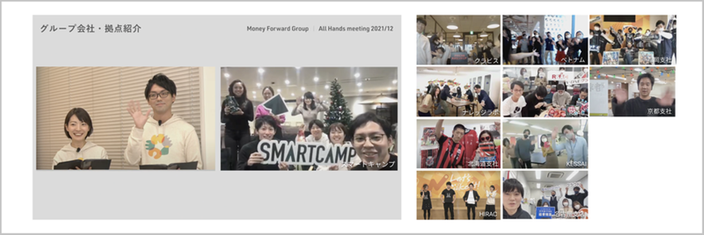 グループ会社&拠点紹介は、それぞれの会社、全国各地や海外にある拠点をリアルタイムで中継をして、現場からオフィス紹介などコメントをもらいます。まるで、朝のお天気番組のような演出で、全国でマネフォグループは繋がっていることを実感できる演出でした。