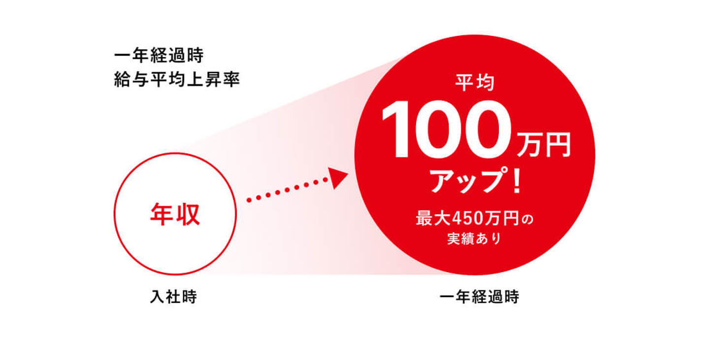 そうですね、実際に入社一年経過時の給与上昇額についてみてみると、平均して一人あたりの年収が100万円上がっています。中には、最大で450万円強UPした社員もいます。