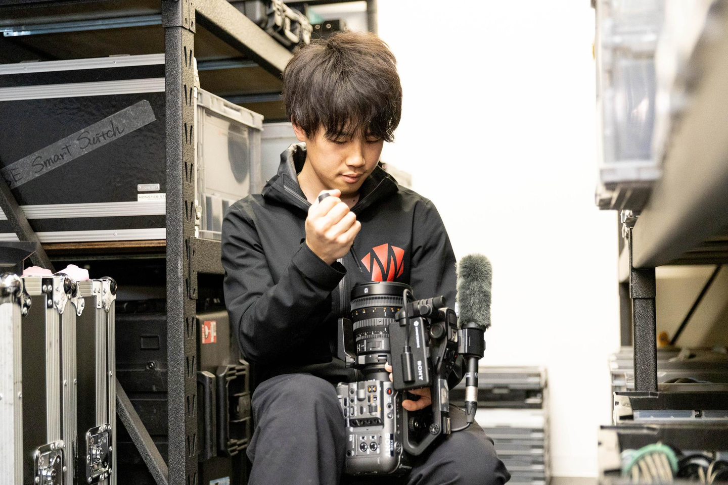 ▼本番前のスタジオの光景です。カメラや音声などの機材チェックを済ませ、本番に挑みます。黒で統一された姿は裏方そのものです!