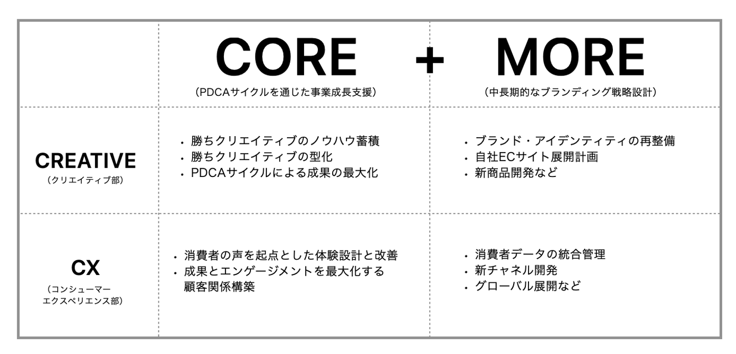 各ブランドの事業成長に不可欠なKPI設定、日々の数値トラッキングの実行、PDCAサイクルを通じた事業の持続的な拡大支援などにフォーカス